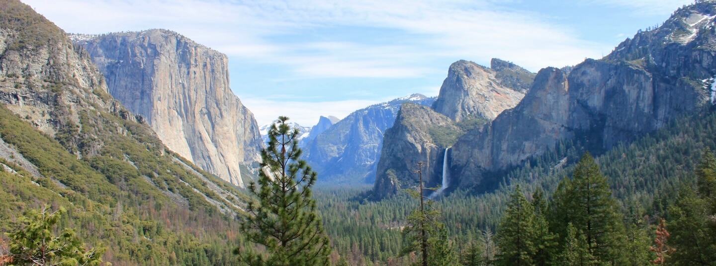 The road to Yosemite Valley is windy, curvy and narrow at times with steep pitches on each side (and no guard rails). Deer and other wildlife may cross at any point so drive with caution. One of the best and most famous panoramas in the valley is immediately after you come through a long tunnel on Hwy 41. When you exit the tunnel you will see a parking lot to the left that is tiny and most likely full. Go 100 feet farther to a second parking lot on the right which has much more parking (but is still small). This area is known as Tunnel View and includes El Capitan, Half Dome, Bridalveil Fall, and Clouds Rest.